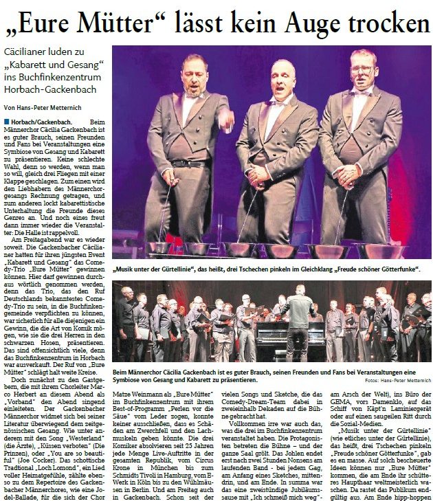 Mit nur 0,5 Punkten Rückstand auf den erstplatzierten Männerchor aus Watzenborn-Steinberg und einem hervorragenden zweiten Platz kehrten die Gackenbacher Sänger vom sakralen Chorwettbewerb in Frickhofen zurück ins Buchfinkenland. Die Sänger, die sich seit Beginn des Jahres intensiv auf den Wettbewerb vorbereitet haben, können stolz auf ihre Leistung sein.
